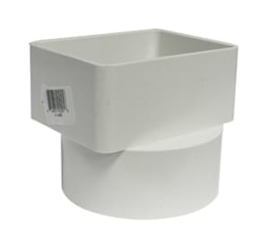 - Installed on a rainwater downspout pipe end to transition to a PVC white sewer pipe. Fitting allows for an installation close to the building wall.