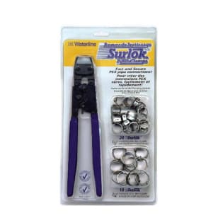 This Waterline set from the Surlok series includes an 11 in crimp tool with a rubberized grip handle and 30 stainless steel clamps for 1/2 in and 3/4 in pipes.